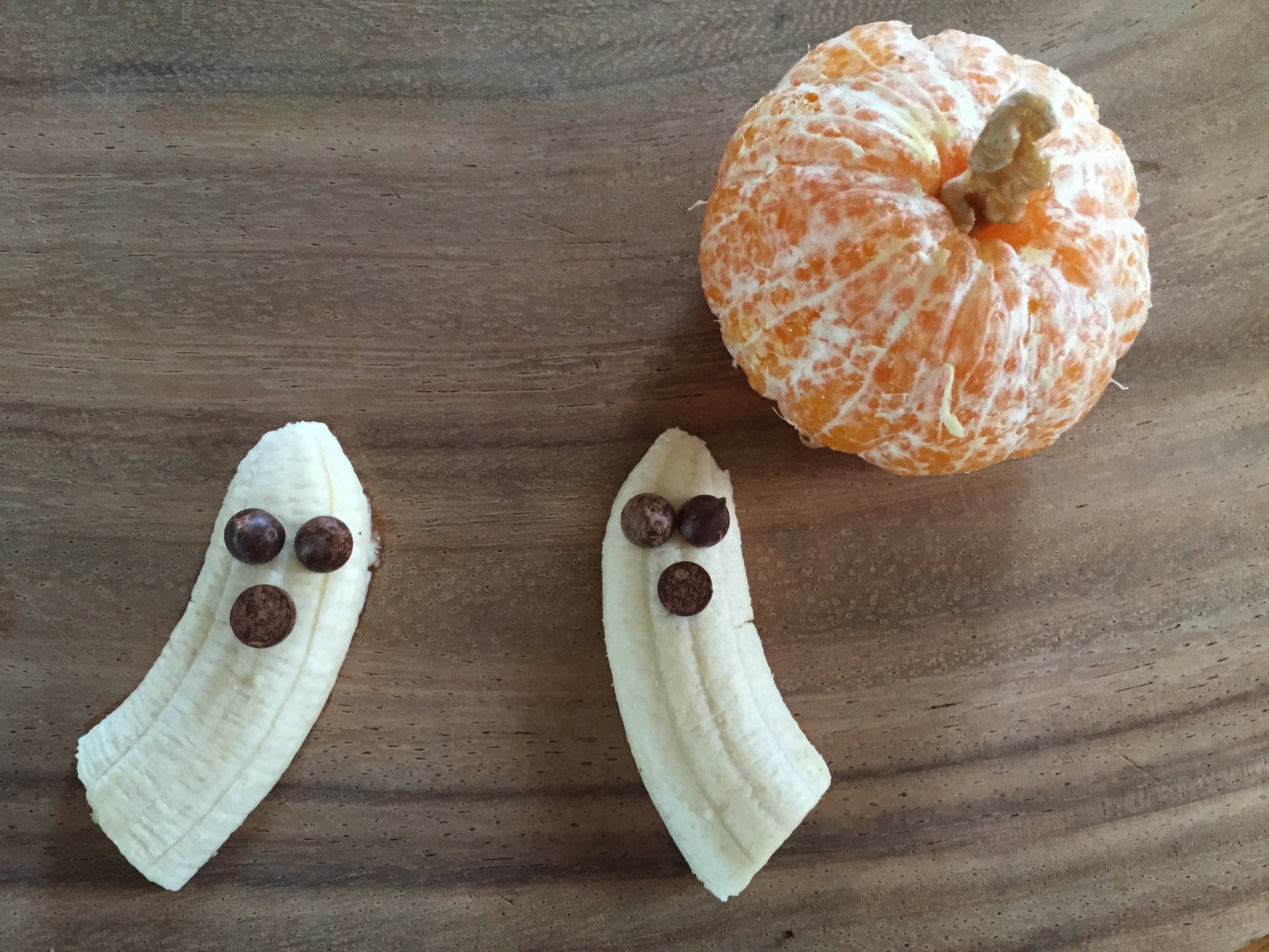 I use seaweed to cut out the faces for the persimmons and chocolate chips for the ghost eyes. You can use walnuts for the pumpkin stems or celery pieces. Be creative, you might be surprised what gets eaten when the food as art is fun.